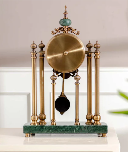 Undeniably nostalgic and charming, this timepiece also embraces modern convenience with ease. Take a step back in time with the intriguing classically-styled table clock. A unique and eye-catching addition to your home, this old-fashioned piece will create an ambience of sophisticated elegance. Crafted with meticulous attention to detail, the clock features a polished metal frame, a swinging pendulum, and a classic clock face adorned with European numerals. Its charming design seamlessly blends vintage aesthetics with modern functionality, creating a distinctive timepiece that adds a touch of refinement to any tabletop or mantel.